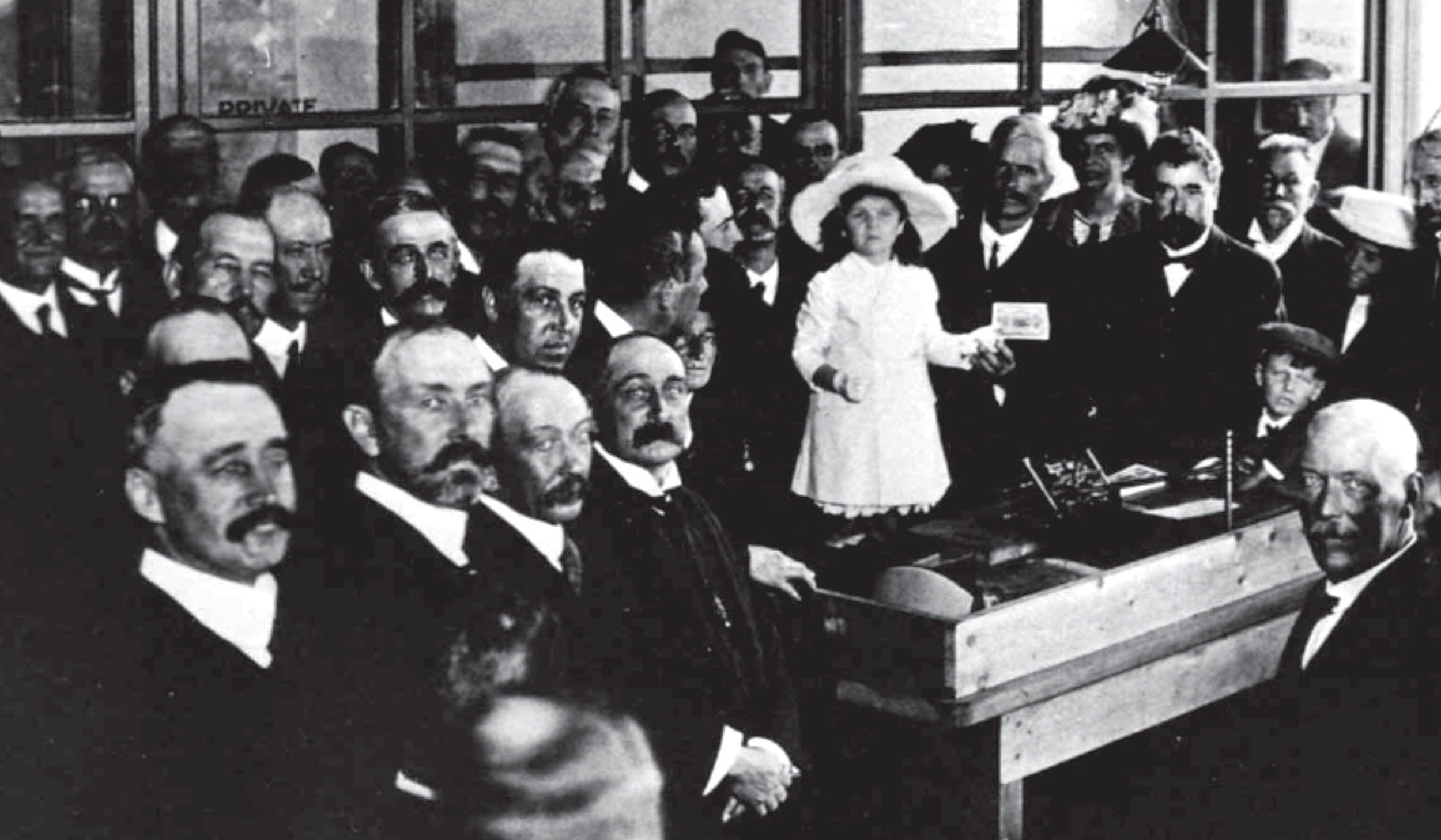 1 May 1913: The Governor General’s daughter, Judith Denman, is presented with Australia’s first banknote - the Ten Shilling - by (L-R) Prime Minister Andrew Fisher and T.S. Harrison at King’s Warehouse.